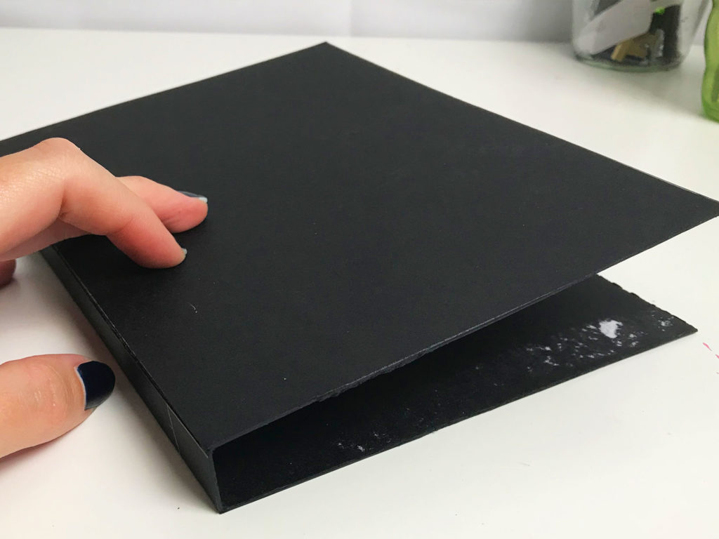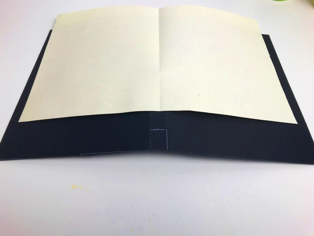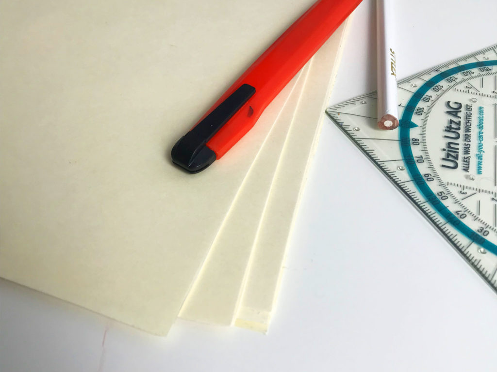 Damit der Buchrücken gut klappen kann, nimm dir das Geodreieck und schneide mit einem Cutter leicht an den Linien entlang, die den Rücken bilden. Dadurch kannst du ihn leichter einknicken.