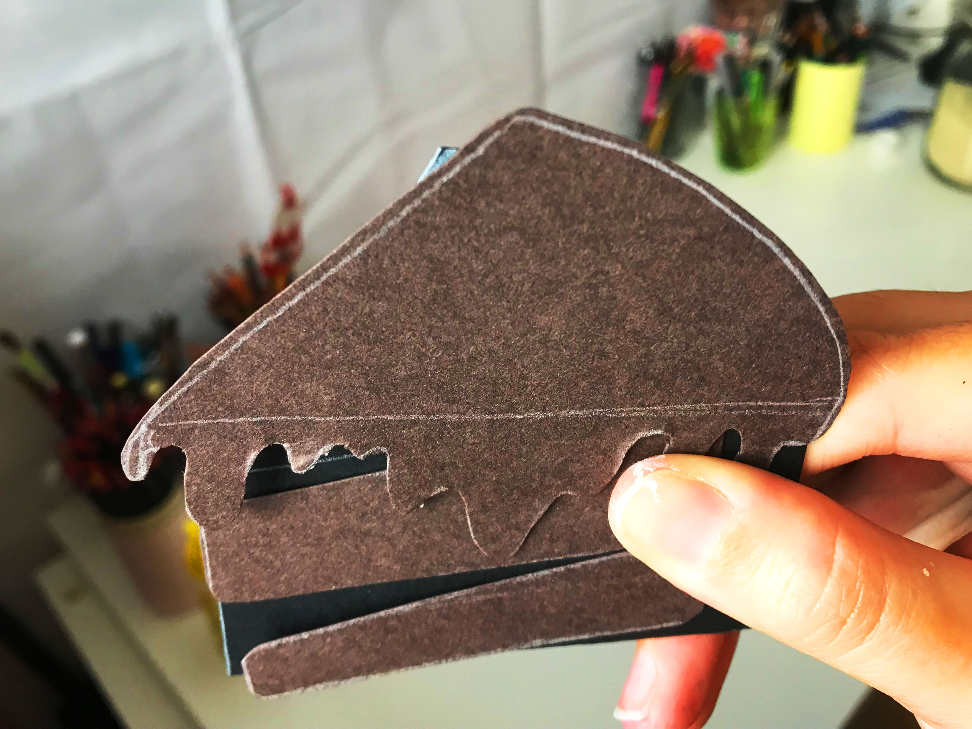 Zuerst schnappst du dir dein Tonpapier und zeichnest dir längliche Dreiecke auf. Du kannst auch eine Kuchenform von der Seite nehmen, dann passen etwas weniger auf das Papier. Das ist deine Basis, die jetzt beklebt wird. Wir arbeiten weiter mit den nur Kuchenformen von der Seite, die ausgeschnitten sind.