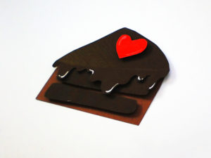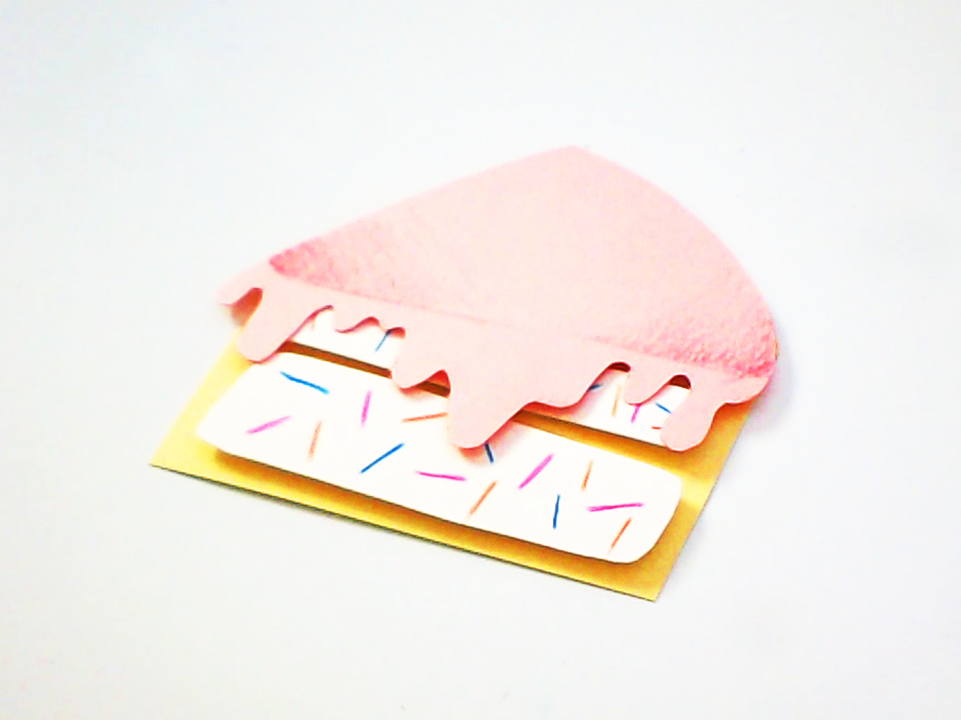 Bevor es ans Dekorieren geht, solltest du dir überlegen, wie die Stücke aussehen sollen. Wir wollen einmal einen Konfetti-Kuchen in hellen Farben machen und als Kontrast einen dunklen, schweren Schokokuchen. Dazu wird das Muster auf ein separates Papier gezeichnet, damit alle Kuchenstücke nahezu gleich aussehen. Dann schneidest du sie aus und klebst sie aufeinander. Mit Klebepunkten bekommen sie einen schönen 3D-Effekt.