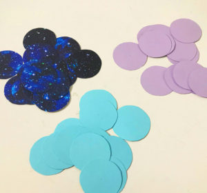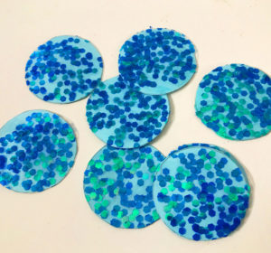 Schnapp‘ dir dein Papier und zeichne Kreise auf, wir haben einen Durchmesser von ca. 4cm genommen. Je kleiner die Kreise, desto mehr brauchst du davon! Am besten schneidest du mehr aus, als du wahrscheinlich brauchst. Wir haben einige der Schuppen mit Glitzer verfeinert, damit diese etwas mehr herausstechen.