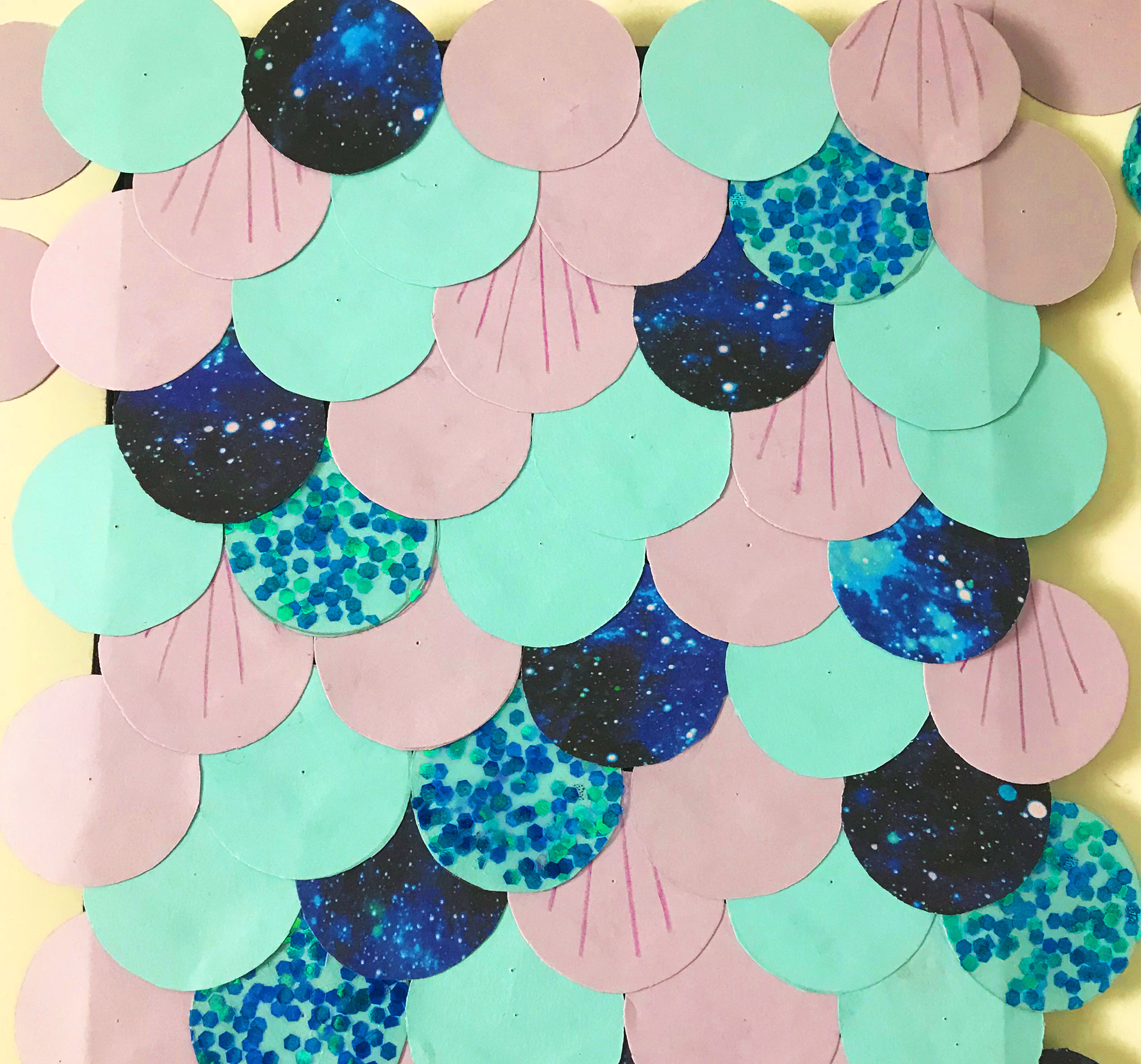 Nun geht es an das Schuppenmuster. Fange dazu vom unteren Rand an und klebe die Kreise nebeneinander auf. Die nächste Reihe klebst du etwas versetzt auf, sodass man ein Schuppenmuster erkennt. So arbeitest du dich nach oben durch. Keine Sorge, wenn am Rand einiges absteht, dazu kommen wir gleich.