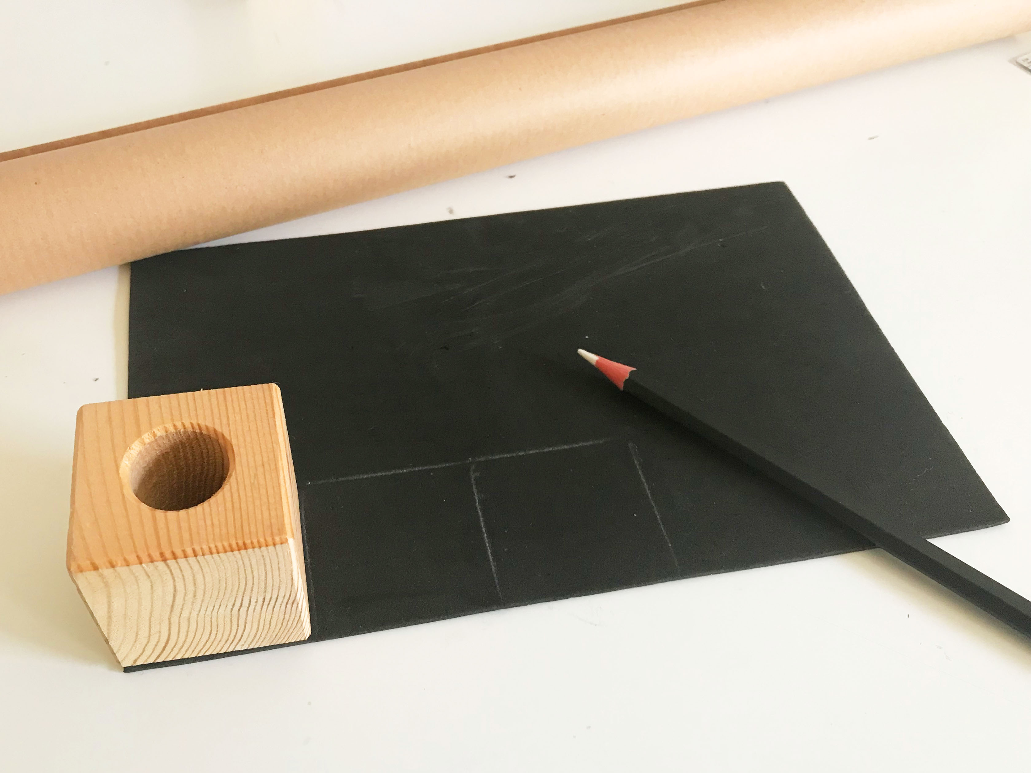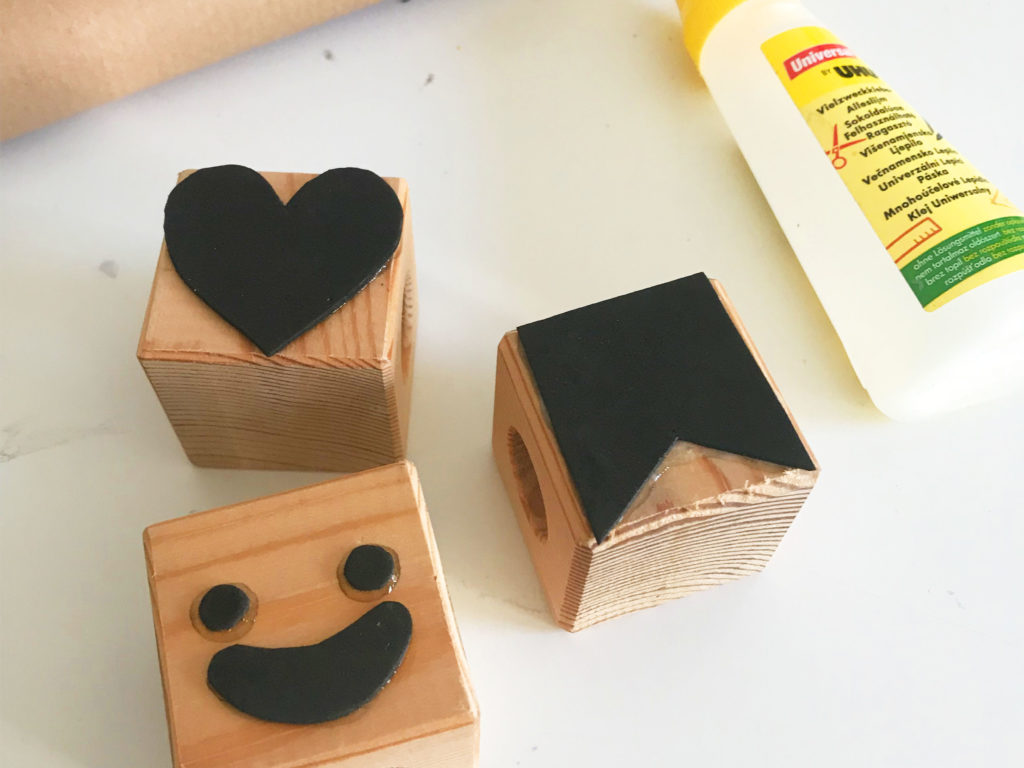 Damit deine Schablonen auf die Holzklötze passen, solltest du sie abmessen. Dafür werden die Umrisse des Holzklötzchens auf das Moosgummi übertragen: innerhalb dieser Form kannst du die Schablone einzeichnen. Wir haben hier ein lächelndes Gesicht, ein Herz und ein Girlandenfähnchen gemacht.