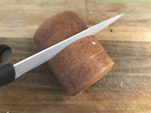 Der schwierigste Teil kommt nun: entferne die Seife vorsichtig aus der Form und rolle sie entland der langen Seite. Achte darauf, dass nichts komplett bricht. Falls anfangs etwas schief geht, keine Sorge- dafür haben wir Geschenkband.