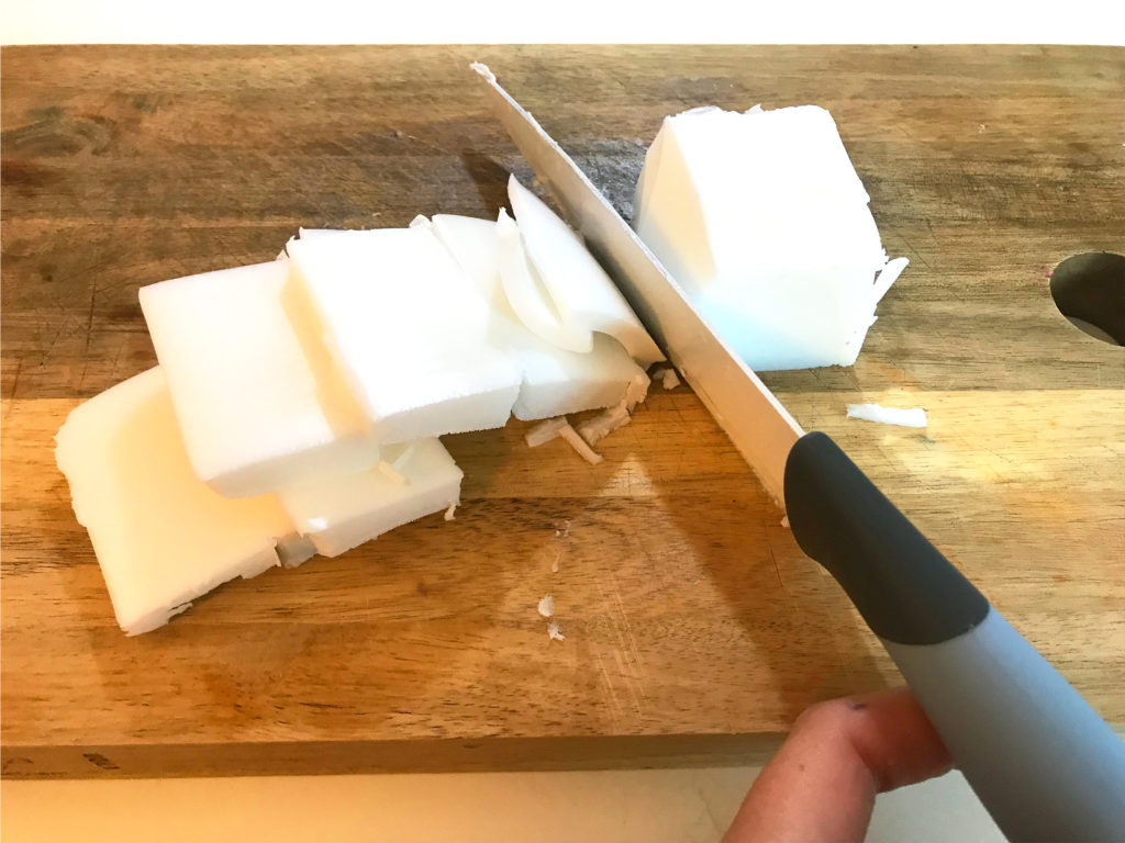 Schneide die Seife in kleinere Stücke, diese schmelzen wesentlich schneller. Fülle sie in drei Schüsseln (da wir hier drei Farben benutzen) und stelle diese in die Mikrowelle oder in den Ofen. Eine genaue Zeit- oder Tempraturangabe hängt von der Menge der Seife ab; in unserem Beispiel hat es 5 Minuten bei 200 Grad gebraucht. Am besten fängst du mit einer kühleren Temperatur an, um die Seife nicht zu verbrennen.