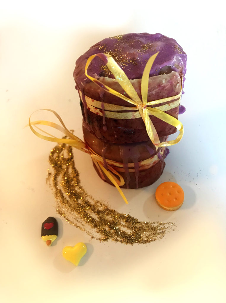 Nun halbierst du die Rolle, sodass die glatten Seiten den Boden bilden. Schnapp dir etwas Geschenkband und binde die Zimtschnecken damit fest. Dieses Band kann auch während des Händewaschens dranbleiben, sodass nach und nach Seife die Zwischenräume füllt und etwaige Risse Geschichte sind. Zum Schluss kannst du einen Zuckerguss aus Seife darübergießen, wir haben uns für lila entschieden, weil er farblich super zum gelben Geschenkband passt. Eine schöne Verpackung drum herum, und fertig! Wir wünschen dir super viel Erfolg.